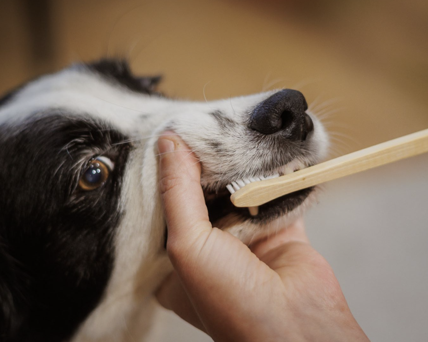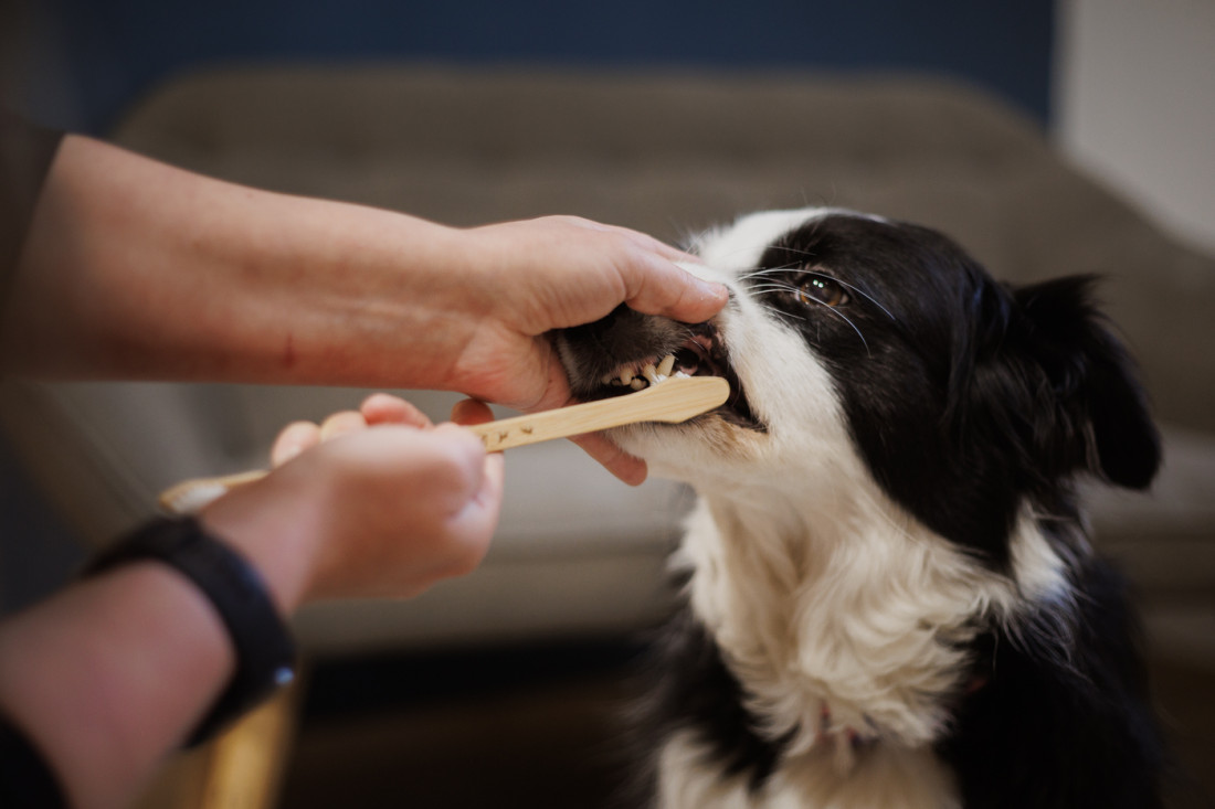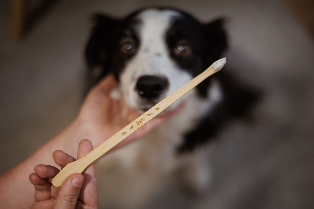 Oboustranný bambusový kartáček na psí zuby – šetrný k dásním, účinný proti plaku a pohodlný do ruky.